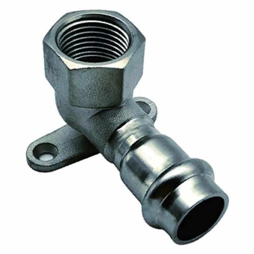 Пресс-угольник из нержавеющей стали с переходом на внутреннюю резьбу 1/2" и креплением (водорозетка) обеспечивает соединение тонкостенной стальной трубы Dn 22 мм с резьбовым элементом (в частности, патрубком сантехнического смесителя) монтируемой системы под углом 90°.