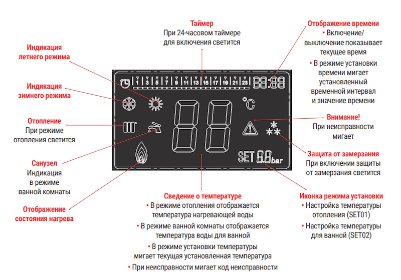 На ЖК-дисплее, который также находится на панели управления, отображается текущая температура как горячего водоснабжения, так и системы отопления, что делает процесс контроля за температурой простым и интуитивно понятным. Кроме того, на дисплее отображаются пользовательские настройки, что позволяет легко настроить котел под свои индивидуальные потребности.